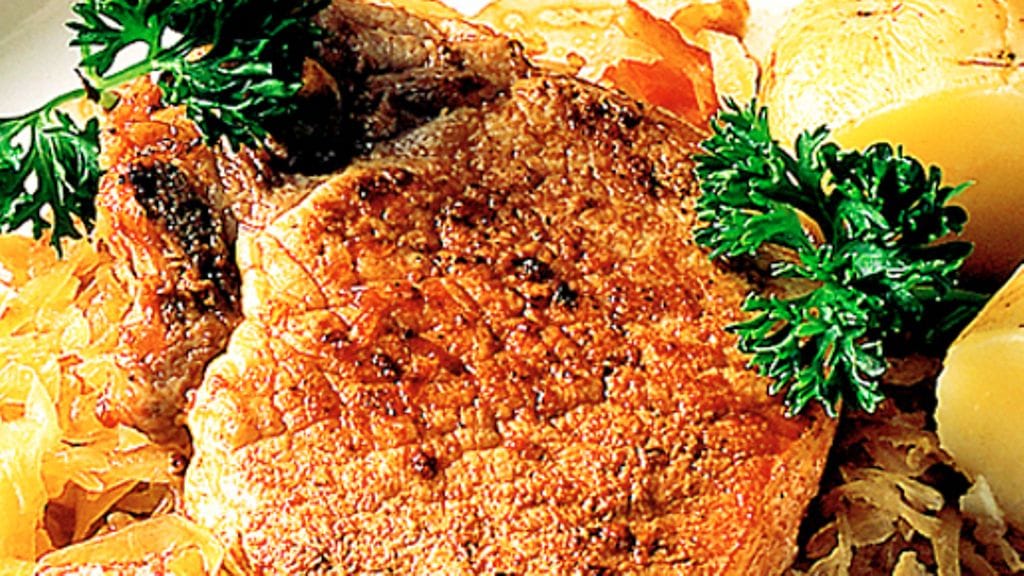 3. Mausta kyljykset suolalla ja pippurilla ja kääntele vehnäjauhoissa. Paista kyljykset kuumalla paistinpannulla voissa kullanruskeiksi. Tarjoa heti hapankaalin ja perunoiden kera.