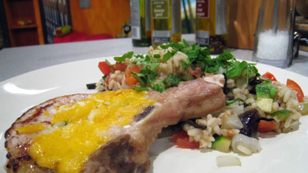 Paista kyljyksiä kummaltakin puolelta öljyssä, jotta saat niihin kauniin värin. Mausta kyljykset kummaltakin puolelta suolalla ja pippurilla ja asettele ne uunivuokaan. Laita kullekin kyljykselle salvianlehti ja ruokalusikallinen juustoraastetta.