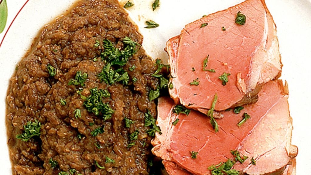 3. Soseuta halutessasi linssit ja kasvikset yleiskoneessa. Soseuttaminen ei kuitenkaan ole välttämätöntä. lämmitä linssit kattilassa ja mausta vastajauhetulla pippurilla. Lisää tarvittaessa suolaa. Leikkaa liha paksuiksi viipaleiksi ja tarjoa linssien kera.