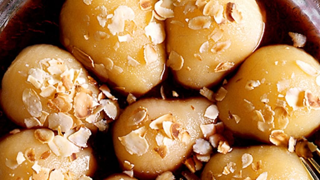 3. Kaada viiniliemi päärynöille, koristele mantelilla.
