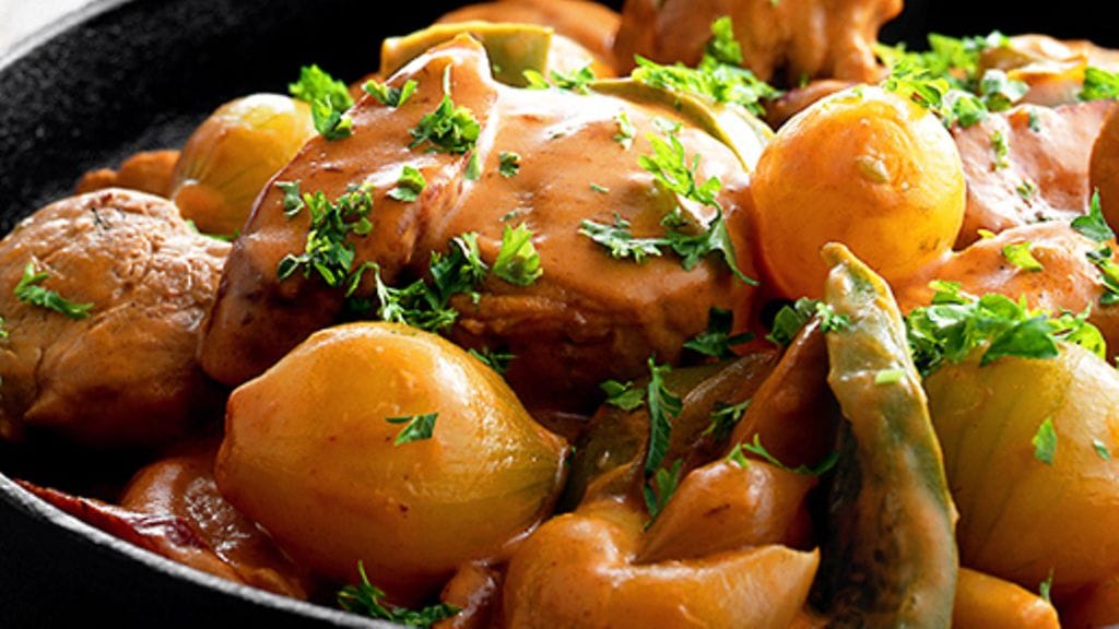 3. Kaada kastike lihojen ja sipulien päälle pataan. Kuumenna kiehuvaksi ja keitä ihan hiljaa 15 minuuttia. Sirottele padan pinnalle persiljasilppua tarjolle tuotaessa.