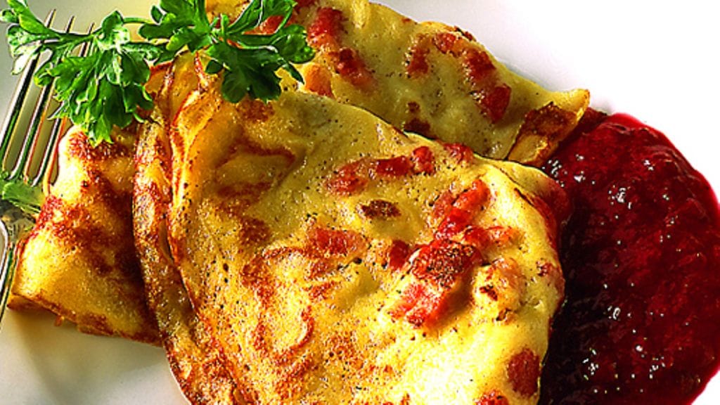 1. Vatkaa munat ja jauhot tasaiseksi taikinaksi. Lisää maito, kerma ja suola. Jätä taikina turpoamaan vähintään tunniksi. Leikkaa siankylki ohuiksi suikaleiksi ja ruskista rapeaksi.