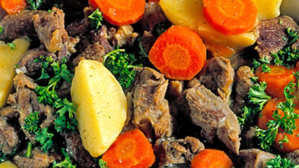 2. Lisää sipuli ja juurekset. Keitä kunnes liha on mureaa. Sirota persiljasilppua pinnalle.
