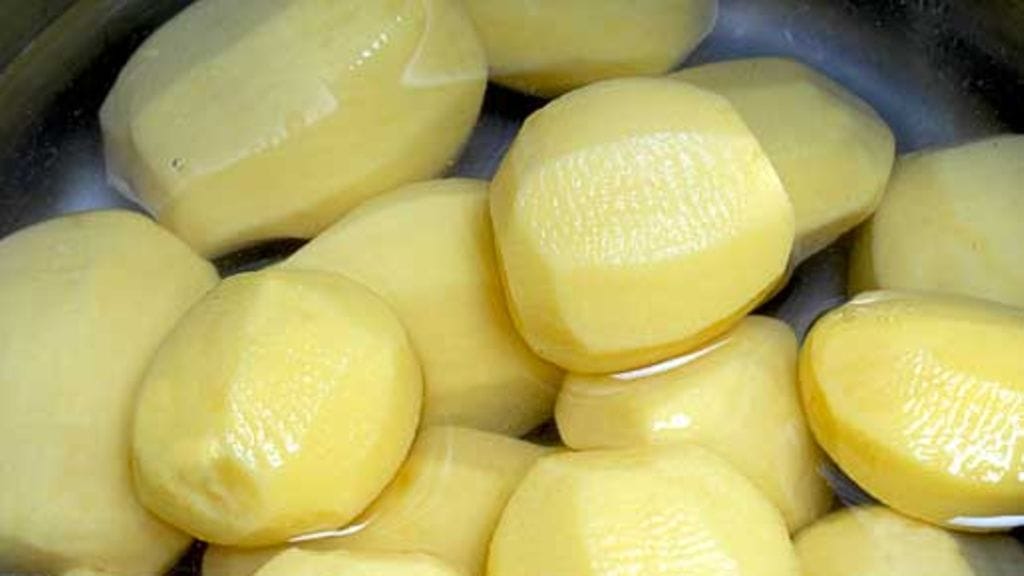 1. Huuhdo ja kuori tasakokoisia perunoita. Keitä vesi ja lisää perunat. Suolaa. Anna perunoiden poreilla hiljaisella lämmöllä kansi raollaan 20-25 minuuttia tai kunnes ne ovat täysin pehmeitä.