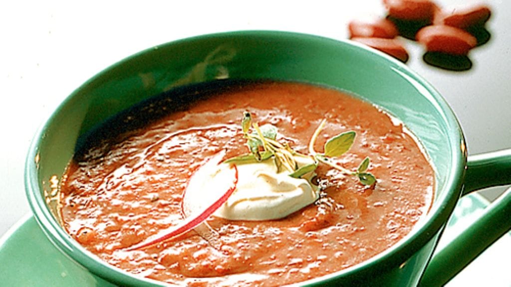 2. Mausta keitto oliiviöljyllä ja balsamiviinietikalla sekä suolalla ja pippurilla. Koristele punasipulisuikaleilla, kermaviilillä ja tuoreella timjamilla tai oreganolla.