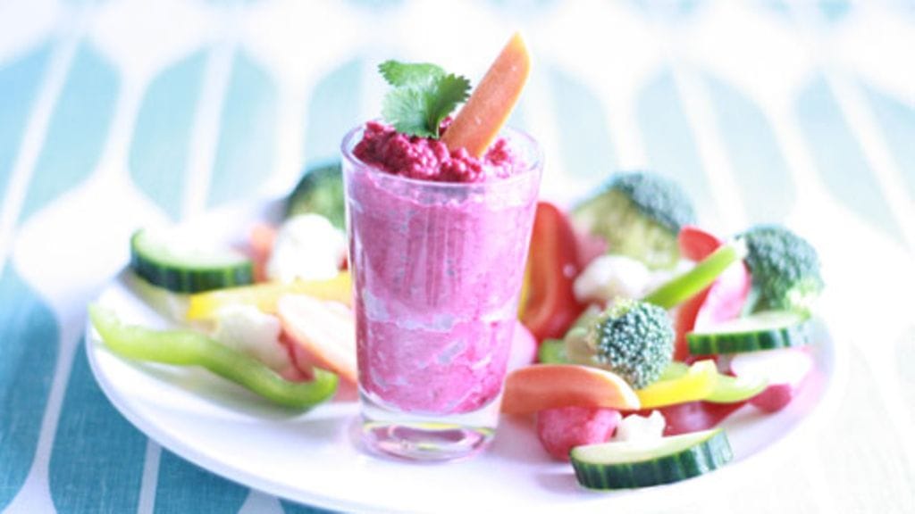 (Kuori ja) leikkaa kasvikset suikaleiksi sekä muiksi sopiviksi annospaloiksi. Tarjoa punajuurihummuksen kanssa.