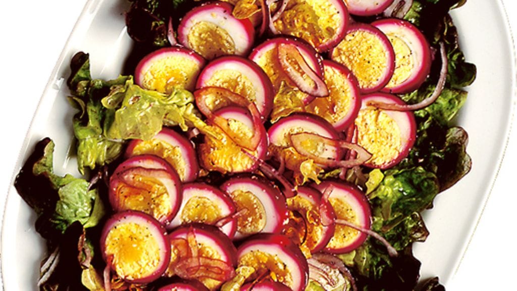 1. Kiehauta punajuuriliemi, viinietikka ja kaikki mausteet. Kaada liemi keitettyjen kuorittujen munien päälle. Peitä astia ja anna munien marinoitua jääkaapissa vähintään vuorokauden.