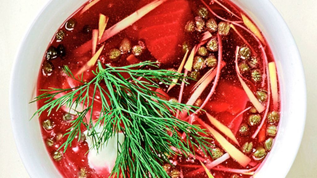 3. Kuori valkosipulinkynnet ja suikaloi ne. Suikaloi loput purjosta ja porkkanasta. Leikkaa lohifilee kahden sentin kuutioiksi. Kuumenna öljyä kattilassa, kuullota porkkanaa, purjoa ja valkosipulia ruskistamatta. Kaada päälle lohiliemi ja punajuuren keitinliemi ja keitä kokoon ilman kantta 10 minuuttia. Lisää lohikuutiot, punajuurisuikaleet ja kaprikset ja anna poreilla vielä 5 minuuttia. Mausta keitto suolalla ja pippurilla myllystä. Tarjoile keitto smetanan ja tillin kanssa.