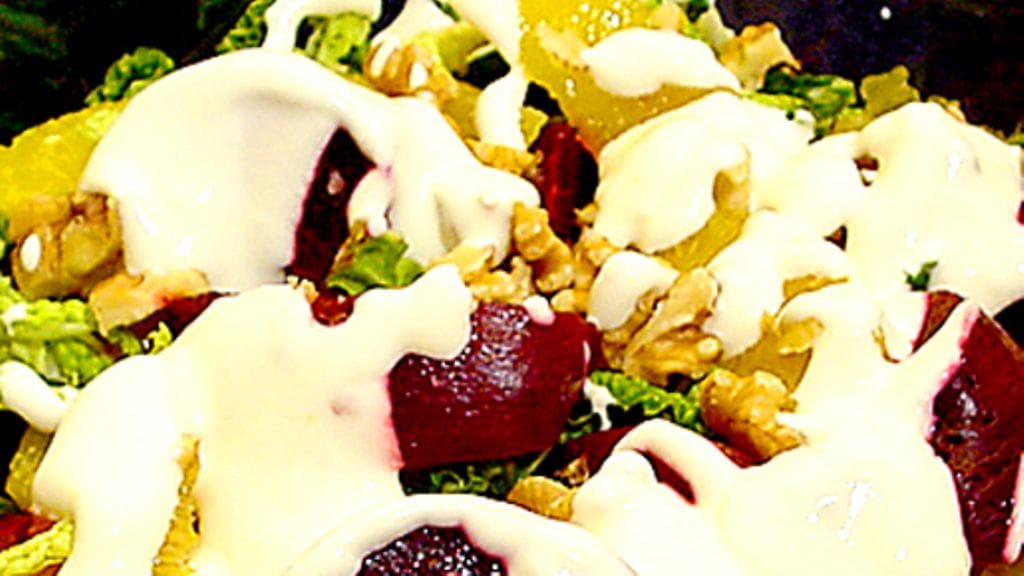 2. Kuori appelsiinit terävällä veitsellä ja poista viipaleista kalvot. Suikaloi kaali. Kerrostele punajuurilohkoja, kaalisuikaleita ja appelsiiniviipaleita tarjoilukulhoon. Mausta kerrosten välit. Rouhi pähkinät ja sirottele päälle.