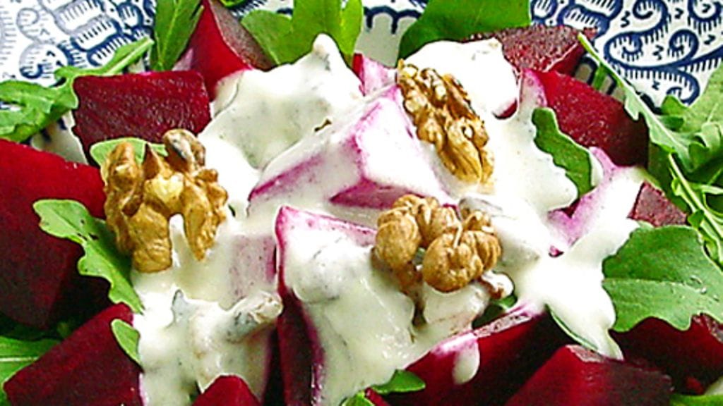 3. Kaada kastike punajuurien päälle. Pane kylmään tunniksi. Voit myös asetella punajuurilohkot vadille salaatinlehtien ja punajuurenlehtien kanssa ja valuttaa päälle jogurttikastiketta.