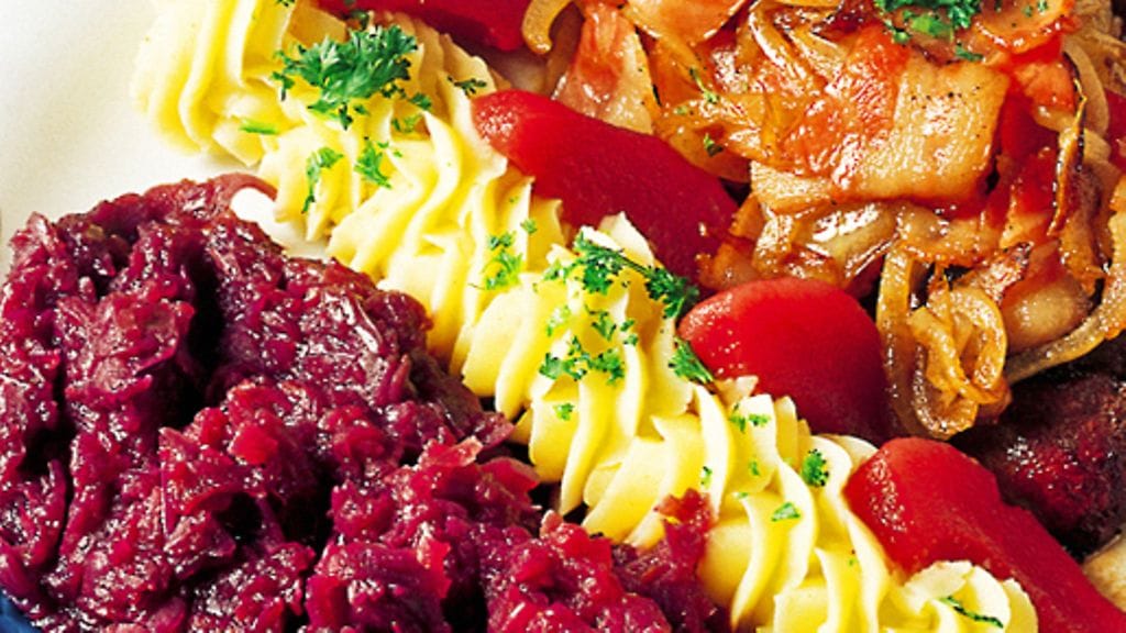 3. Tarjoile maksa punakalin, päärynänpuolikkaiden ja perunasoseen kanssa. Koristele pekonilla ja sipulirenkailla.