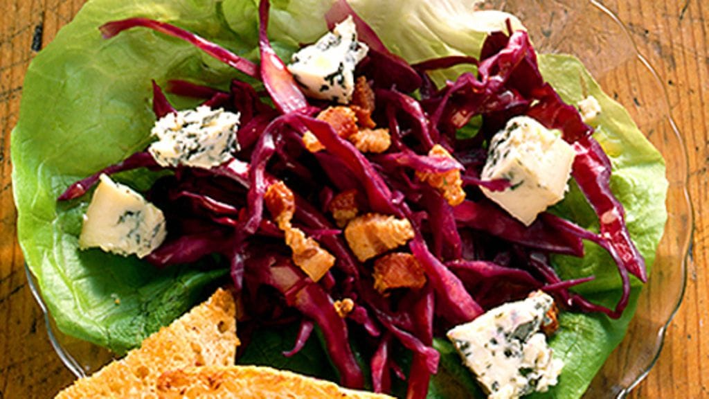 2. Suikaloi kaali ja murusta juusto. Huuhtele salaatinlehdet ja laita ne neljälle lautaselle, niiden päälle kaalia ja juustoa. Ripottele päälle siankylkeä.