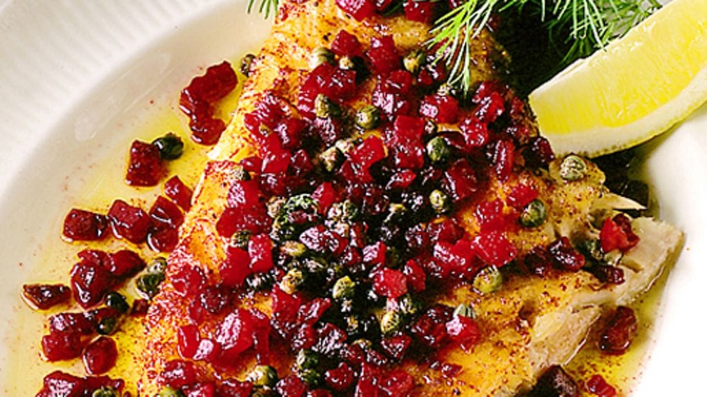 3. Kuumenna voi pannussa ja lisää kaprikset ja punajuuret. Ruskista muutama minuutti. Kaada seos kampeloiden päälle ja tarjoile heti sitruunan, tillin ja keitettyjen perunoiden kanssa.