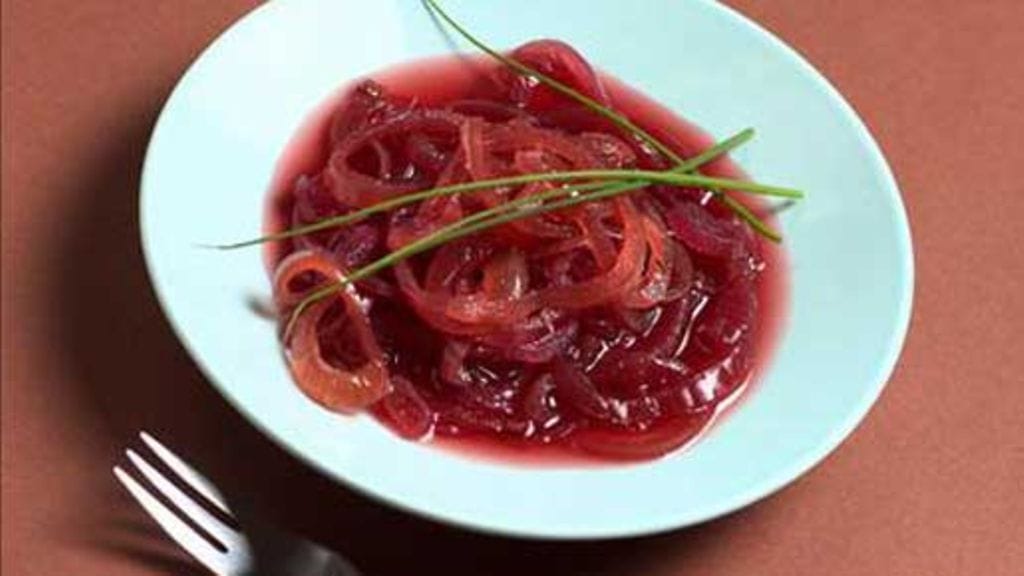Laimenna herukkamehu hieman juomisvahvuutta väkevämmäksi. Kaada mehu ja sokeri sipuleiden päälle. Keitä hiljalleen noin tunnin verran.