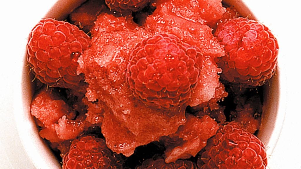 3. Lusikoi jääseos tarjoilukulhoihin ja suuriin laseihin ja asettele vadelmat kauniisi ylimmäksi. Jos käytät pakastemarjoja, anna niiden vain juuri ja juuri sulaa, etteivät ne vesitä jälkiruokaa.