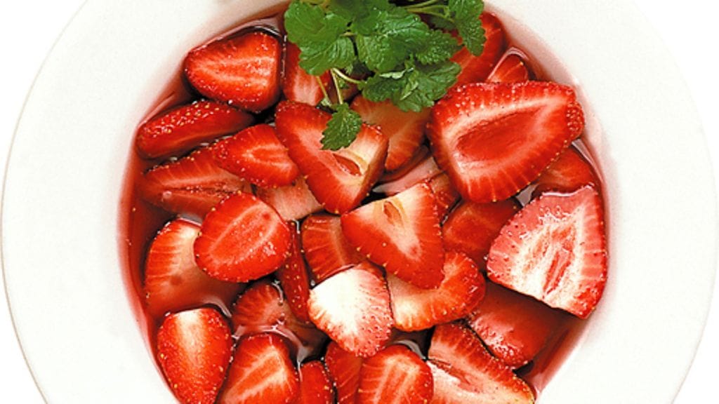 2. Jaa mansikat annoskulhoihin tai laseihin ja kaada niiden päälle viini. Anna mansikoiden maustua jääkaapissa muutama tunti ennen tarjoilua. Koristele annokset mintulla tai sitruunamelissalla.