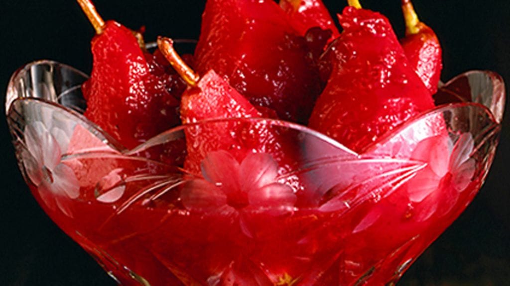 1. Kuori päärynät mutta jätä varret paikalleen. Kuumenna puolukkamehutiiviste, vesi ja mausteet niin pienessä kattilassa kuin mahdollista, kunhan päärynät mahtuvat mukaan. Lisää päärynät niin että ne peittyvät liemestä.