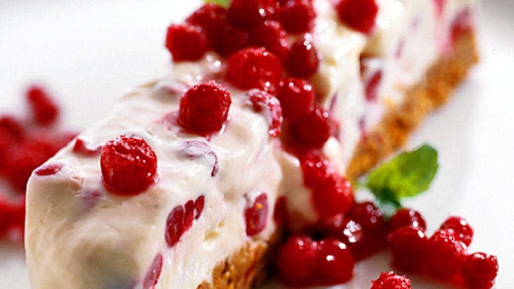 3. Kaada taikina keksipohjalle ja pakasta 5-6 tuntia. Ota pakastimesta ja anna sulaa jääkaapissa n. 15 minuuttia ennen tarjoilua. Ripottele päälle loput puolukat, koristele sitruunamelissalla.