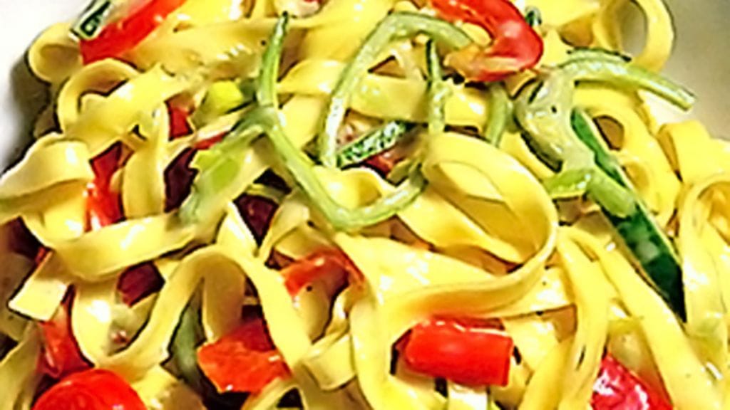 1. Keitä pasta pakkauksen ohjeen mukaan. Kuutioi paprika, puhdista ja suikaloi purjo.
