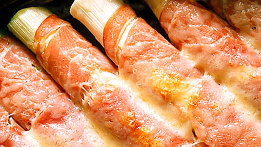 2. Kääri jokainen purjopala kinkkuviipaleeseen, laita uunivuokaan ja ripottele päälle juustoraastetta. Gratinoi uunissa kunnes juusto on sulanut.