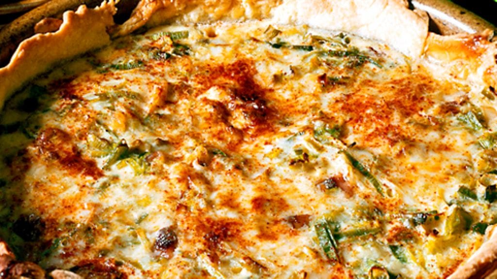 5. Vatkaa kaikki täytteen ainekset, lisää purjo ja kaada piiraskuoreen. Paista kypsäksi uunissa n. 20 minuuttia.