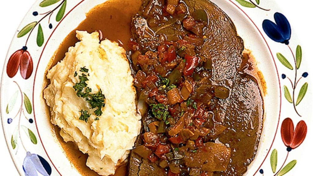 3. Ruskista paisti ja anna sille hieno paistopinta joka puolelta pannussa. Laita sitten paisti paprikaseokseen. Pistä paksuimpaan kohtaan paistolämpömittari. Jos haluat paistin olevan sisältä vaaleanpunainen, se on valmis, kun sisälämpötila on 70 astetta. Jos haluat sen läpikypsäksi, odota 75 asteeseen. Nosta paisti padasta ja pidä se lämpimänä alumiinifoliossa. Nosta sitruunankuori kastikkeesta. Anna kastikkeen kiehua kokoon hieman paksummaksi. Viipaloi paisti ja tarjoile kastikkeen kera.