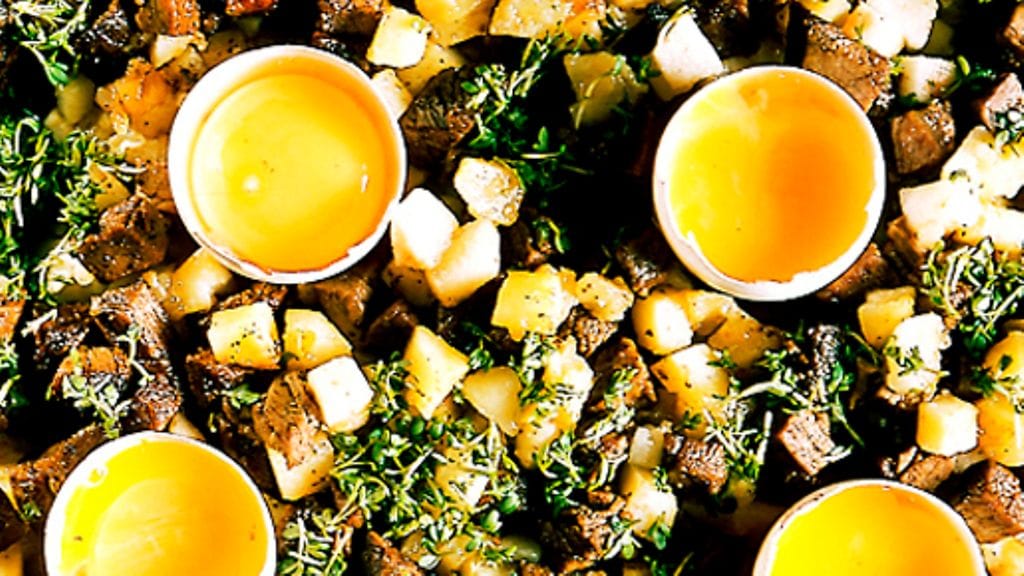 3. Paista viimeiseksi lihat ja kääntele mukaan perunasekoitukseen. Mausta mustapippurilla ja ripottele päälle krassia. Tarjoile munankeltuaiset pyttipannun kanssa kuoristaan.
