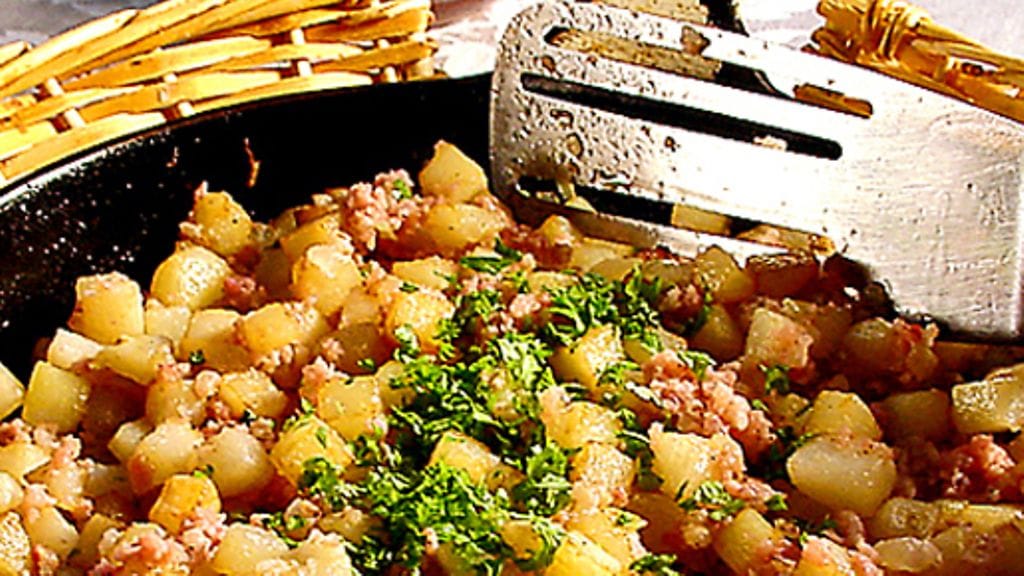 1. Kuori ja hienonna sipuli. Kuumenna voi tai öljy pannussa ja paista sipuli kullankeltaiseksi. Lisää perunakuutiot.