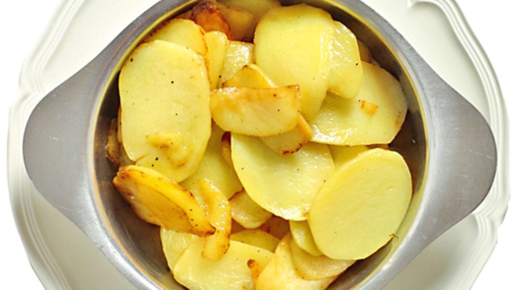 2. Paista viipaleita öljyssä 15-20 minuuttia. Paista perunat joko kahdella pannulla tai kahdessa erässä. Mausta puristetulla valkosipulilla, suolalla ja pippurilla.