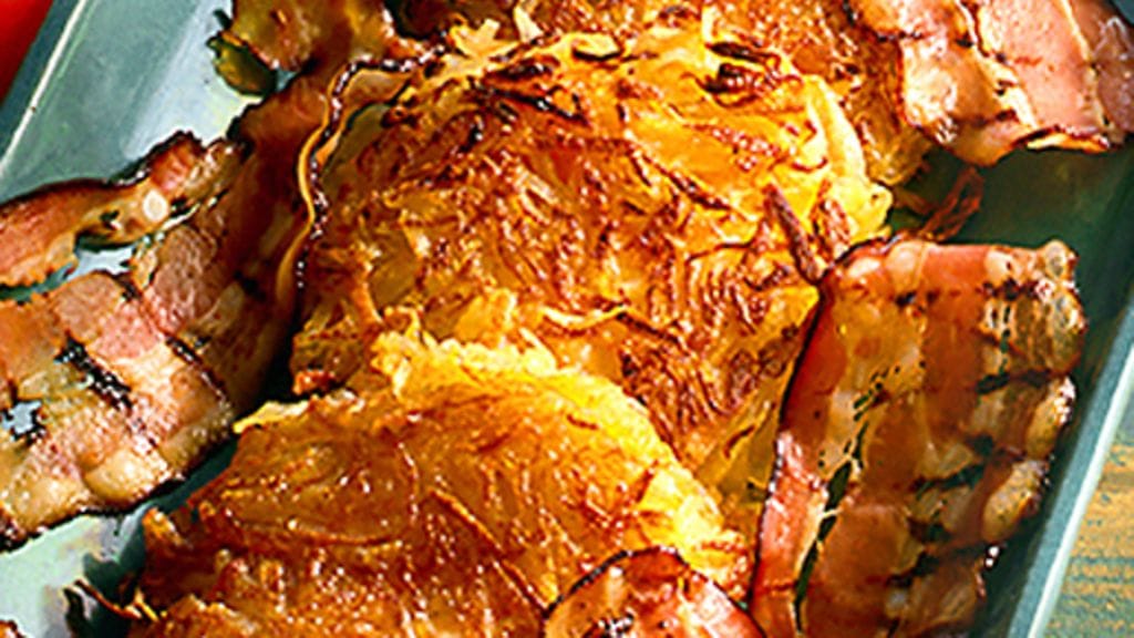 1. Kuori ja raasta perunat. Mausta ripauksella suolaa. Paista pekonit rapeiksi, nopeasti kuumassa pannussa. Pidä lämpimänä.