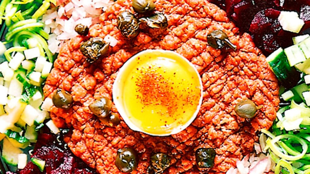 2. Viipaloi purjo hienoksi ja kuutioi punajuuret ja kurkku pieneksi. Aseta munankeltuainen kuoressaan pihville, mausta keltuainen paprikajauheella.