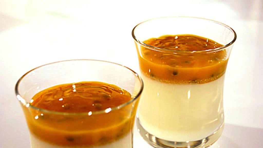 Halkaise passionhedelmä ja koverra sisus mangopyreen joukkoon. Mausta makusi mukaan sokerilla ja kaada seos hyytyneen pannacottan päälle. Koristele esim, suklaatikuilla.