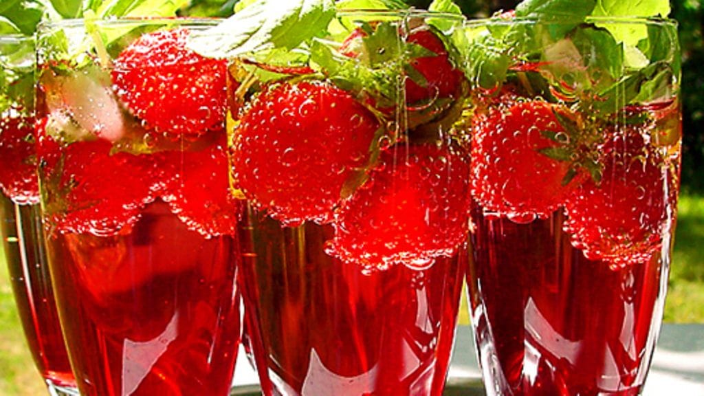 2. Alkoholiton karpalodrinkki: Kaada karpalomehu korkeaan lasiin, täytä limulla. Lisää jääkuutioita ja minttua. Lapset haluavat tavallisesti mansikkansa erikseen, ei sekoitettuna juomaan.