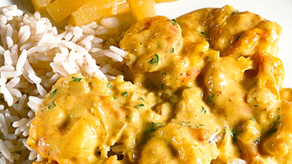 1. Kuori katkaravut ja kääntele ne jauhoissa. Paista sipulia, currya ja cayennepippuria voissa padassa. Lisää katkaravut ja kuumenna. Lisää kerma ja viini, keitä hiljalleen pari minuuttia. Lisää tilli.