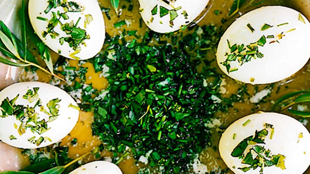2. Aseta lämpimät, vastakeitetyt, kuoritut munat vadille.