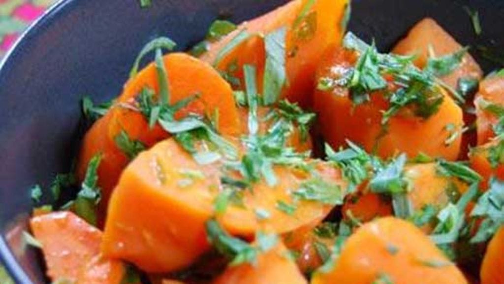 Kuori ja pilko porkkanat suupalan kokoisiksi paloiksi. Keitä suolatussa vedessä melkein pehmeiksi, eli muista tarkkailla porkkanoiden kypsymistä. Kun ne ovat sopivan kypsiä, siivilöi keitinvedestä ja laita kulhoon. Silppua porkkanoiden sekaan tuore rakuuna, purista sitruunan mehu ja lorauta sekaan pari kolme ruokalusikallista oliiviöljyä. Rouhi sekaan vielä suolaa myllystä ja tarkista maku. Tarjoa joko lämpiminä tai viileänä lisukkeena vaikka salaatissa.
