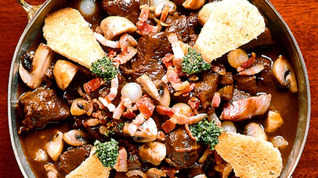 2. Päivä 2: Valuta lihat, sipuli ja porkkana lävikössä, laita se kulhon päälle ja ota marinadi talteen. Paista lihat, sipuli ja porkkana voi-öljyseoksessa pannulla. Laita ainekset pataan, puuteroi jauhoilla ja sekoita. Kaada siivilöity marinadi paistinpannuun jotta loputkin maut irtoavat. Kaada marinadi lihan ja vihannesten kaveriksi pataan. Lisää hieman vettä, ellei marinadi peitä lihoja. Murskaa valkosipulinkynnet. Lisää pataan tomaattipyree, valkosipuli, laakerinlehti, persiljanvarret ja purjo. Mausta suolalla ja pippurilla ja kuumenna kiehuvaksi. Anna kiehua miedolla lämmöllä 1 ½-2 tuntia tai kunnes liha on mureaa.