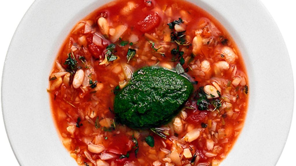 4. Kiehauta keitto juuri ennen tarjoilua. Lisää herneet, paloitellut vihreät pavut ja tuore timjami. Tarjoa pesto erillisestä kulhosta, josta ruokailijat voivat lisätä sitä keittoannoksiinsa.