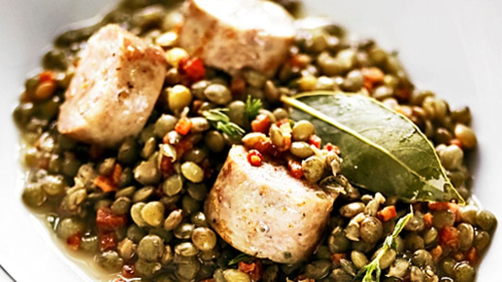 3. Paista makkarat, ensin paistinpannussa, sitten 20 minuuttia uunissa, kunnes niissä on joka puolella kauniinruskea väri. Laita makkarat linssimuhennokseen ja anna hautua vielä 10 minuuttia.