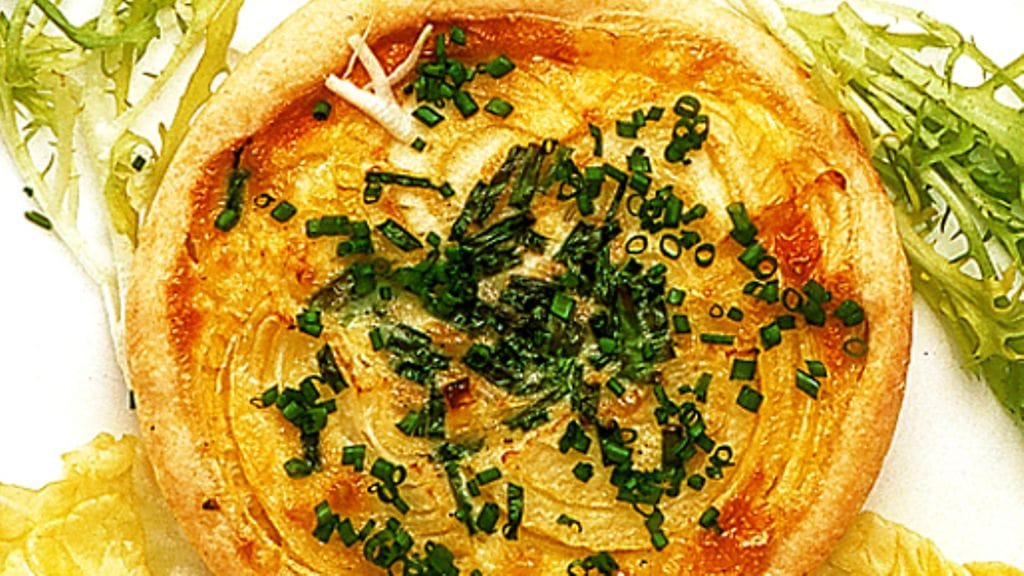 2. Kuori sipuli ja leikkaa se ohuiksi viipaleiksi. Leikkaa siankylki ohuiksi suikaleiksi. Sulata voi pannulla, lisää sipulit ja siankylki ja kuullota miedolla lämmöllä noin 15 minuuttia, älä ruskista. Sekoita välillä. Siirrä pannu levyltä ja anna jäähtyä hieman. Vatkaa munat, keltuaiset, maito ja kerma voimakkaasti. Sekoita joukkoon hienonnettu ruohosipuli ja mausta suolalla, pippurilla ha ripauksella muskottipähkinää.