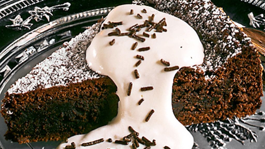 4. Paista kakkua uunin ala tasolla 45-50 minuuttia. Anna jäähtyä vuoassa. Sihtaa päälle tomusokeria, tarjoile kevyesti vatkatun kerman kera.
