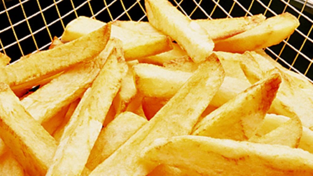 2. Kuumenna öljy 175 asteeseen. Friteeraa perunat sopivissa erissä niin, että ne saavat hennon keltaisen värin. Nosta perunat öljystä ja anna niiden valua.