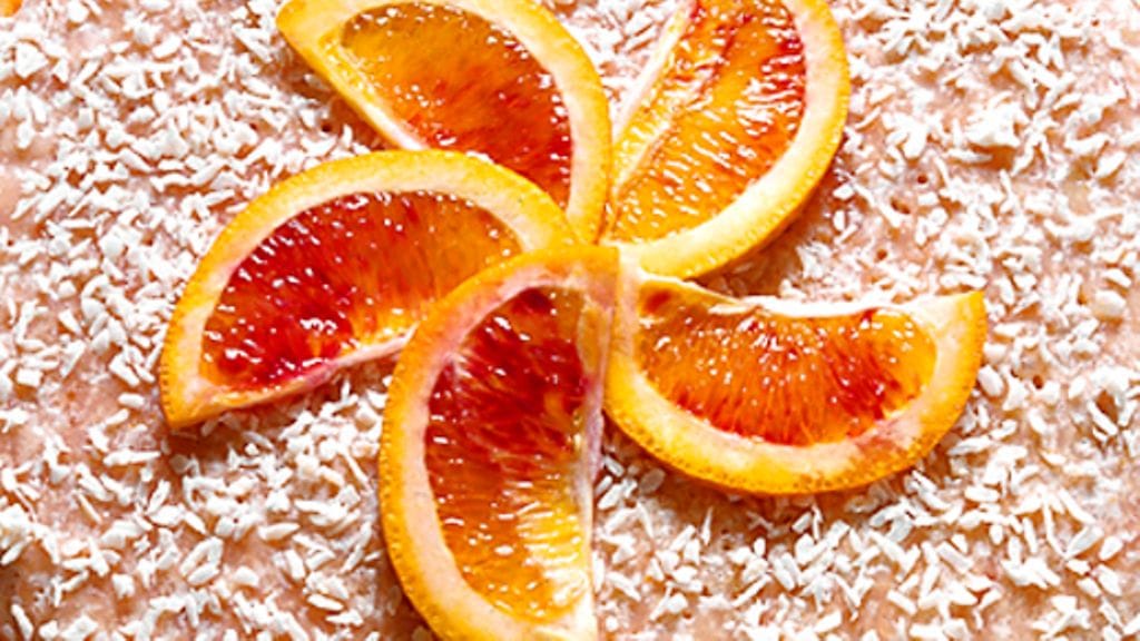5. Kumoa vadille. Ripottele päälle kookosta, koristele appelsiiniviipalein.