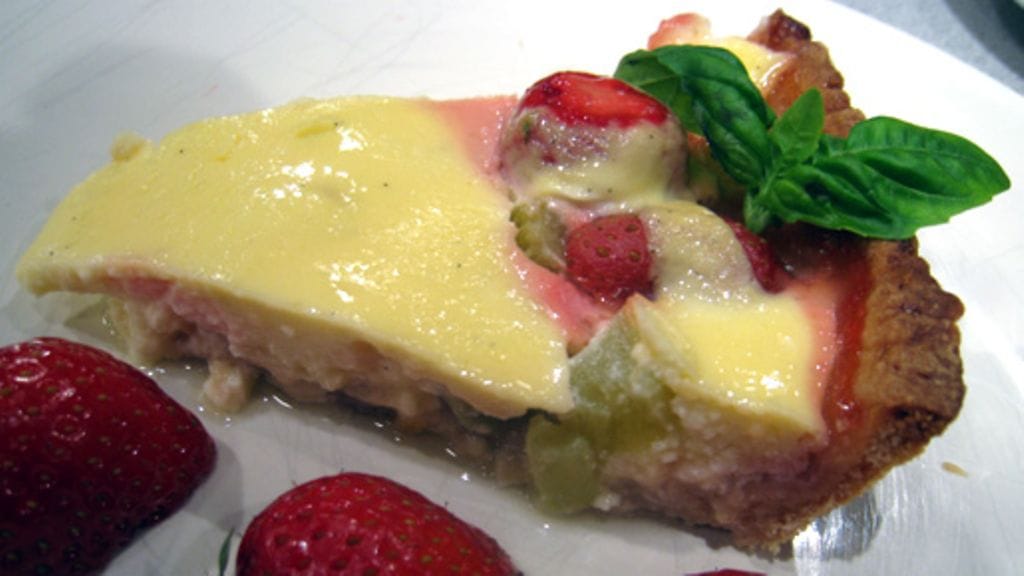 Sekoita keskenään rahka, kananmunat, kerma ja loppu sokeri. Kaada seos piirakkavuokaan.