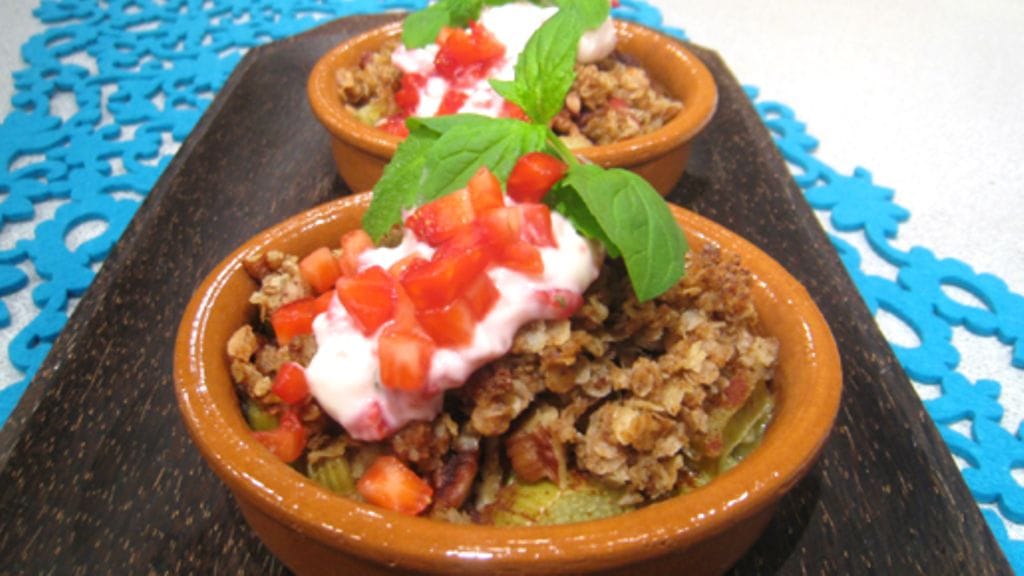 Rahka: Sekoita ainekset ja nauti raparperi-pähkinäpaistoksen kera.