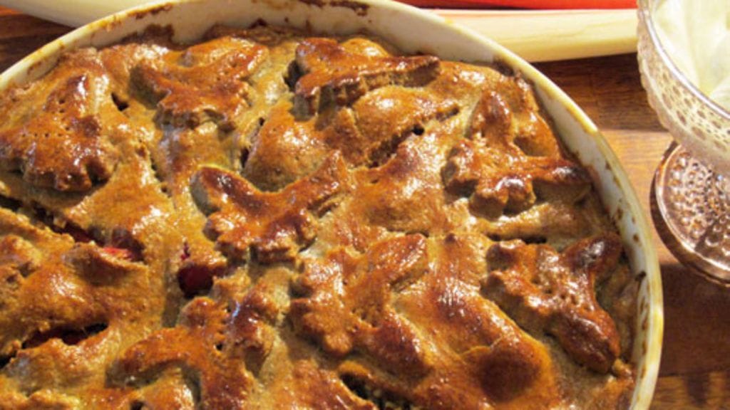 Kauli taikina reilusti vuoan kokoiseksi, levitä se paistoksen päälle. Painele kädellä reunat pois vuoan reunoja pitkin. Tee koristereikiä kanteen terävällä veitsellä. Kauli taikinan loppupaloista koristeita paistoksen päälle, ota esim. piparimuotilla perhosia tai sydämiä. Voitele koko piirakka munalla.