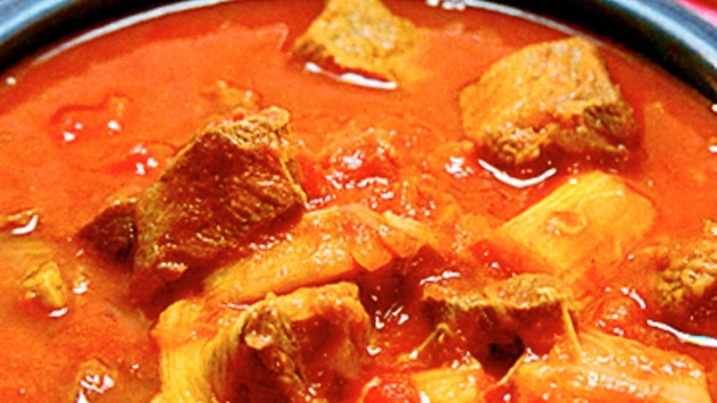 1. Kuori ja hienonna sipuli. Ruskista sipulia öljyssä kurkuman kera isossa kattilassa. Lisää lihat ja paista samalla sekoitellen. Mausta suolalla ja pippurilla. Kaada päälle tomaattimurska ja liemi, kuumenna kiehuvaksi ja anna porista hiljalleen kannen alla n. 1 tunti.