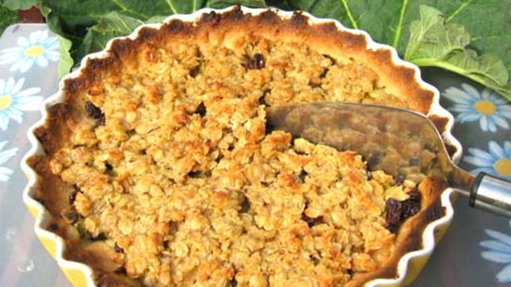 Levitä sulanut tai itse tehty taikina voidellulle ja kaurahiutaleilla leivitetylle piirakkavuoalle. Kuori raparperit, viipaloi ne ohuiksi viipaleiksi ja levitä viipaleet piirakalle tasaiseksi kerrokseksi.