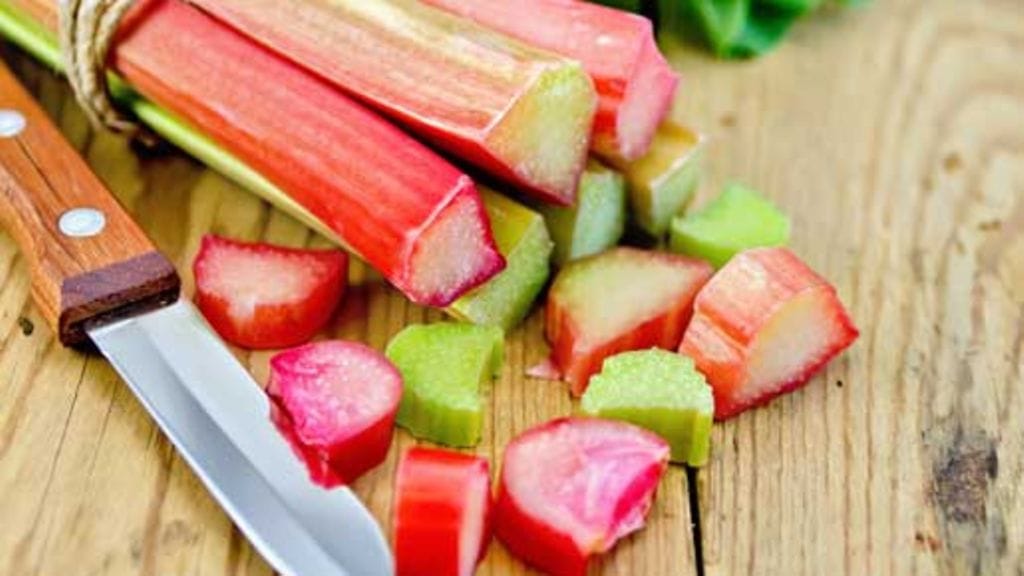 Leikkaa raparperi ohuiksi paloiksi ja levitä hyvin kohonneelle pullapohjalle. Sekoita täytteen muut ainekset keskenään ja kaada seos ohuena nauhana raparperipalojen päälle.