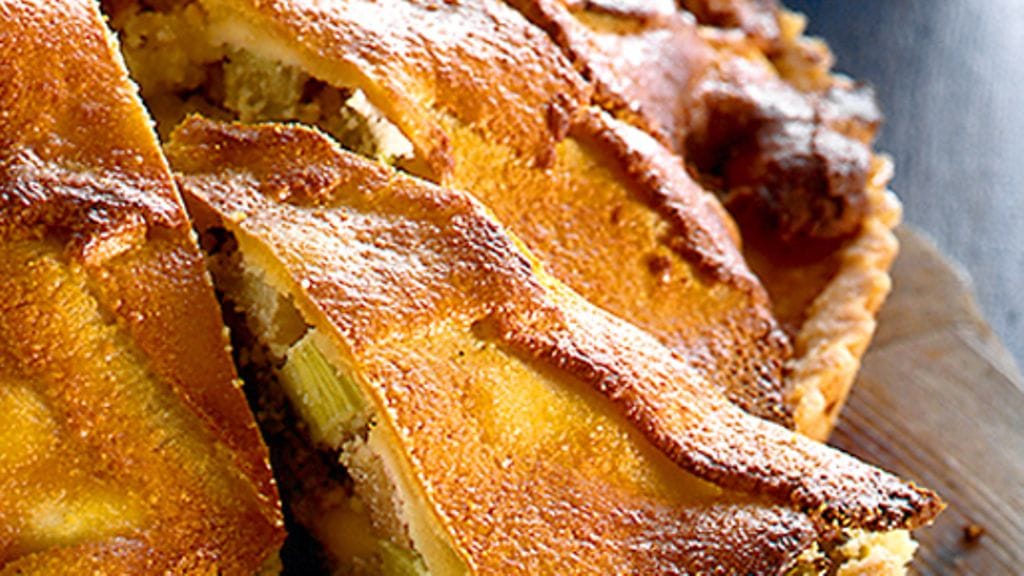 2. Paloittele raparperit, rouhi mantelit karkeasti. Lado raparperia, mantelirouhetta ja sokeria piirasvuokaan. Leikkaa mantelimassa ohuiksi viipaleiksi ja peitä piirakka niillä. Vatkaa muna ja penslaa sillä kansi.